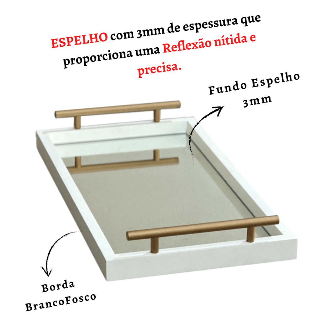 A Bandeja Maraka com espelho é perfeita para adicionar um toque de elegância e sofisticação à sua decoração. Com suas especificações técnicas impecáveis, como o espelho de 3mm que proporciona uma reflexão nítida e precisa, alças em aço inox escovado que garantem durabilidade e resistência, borda em MDF de 15mm que confere estabilidade e segurança, além da pintura em verniz fosco que adiciona um acabamento refinado.